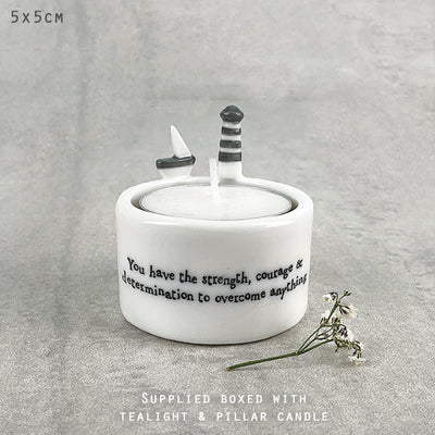 Strength and courage handmade porcelain tealight holder. This beautiful quality porcelain, candle and tealight holder from East of India is the perfect way to add a warm and comforting atmosphere to your home. It makes a lovely and thoughtful gift, with the uplifting sentiment ‘You have the strength, courage & determination to overcome anything’.