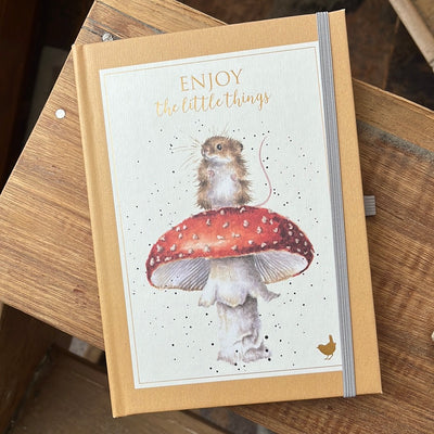The cover of this bullet journal is a cream and mustard yellow colour, with a useful strap to keep it closed. The illustration on the front features a little field mouse perched on its hind legs atop a red and white spotted toadstool, delightfully designed in the watercolour style Hannah Dale does so well. Complete with black paint speckles surrounding the image that give it the trademark Wrendale look. The front of the diary is embellished with gold foiling to give a luxurious feel. Next to the design is the little wren of the Wrendale logo and above the illustration in gold foiling is the text